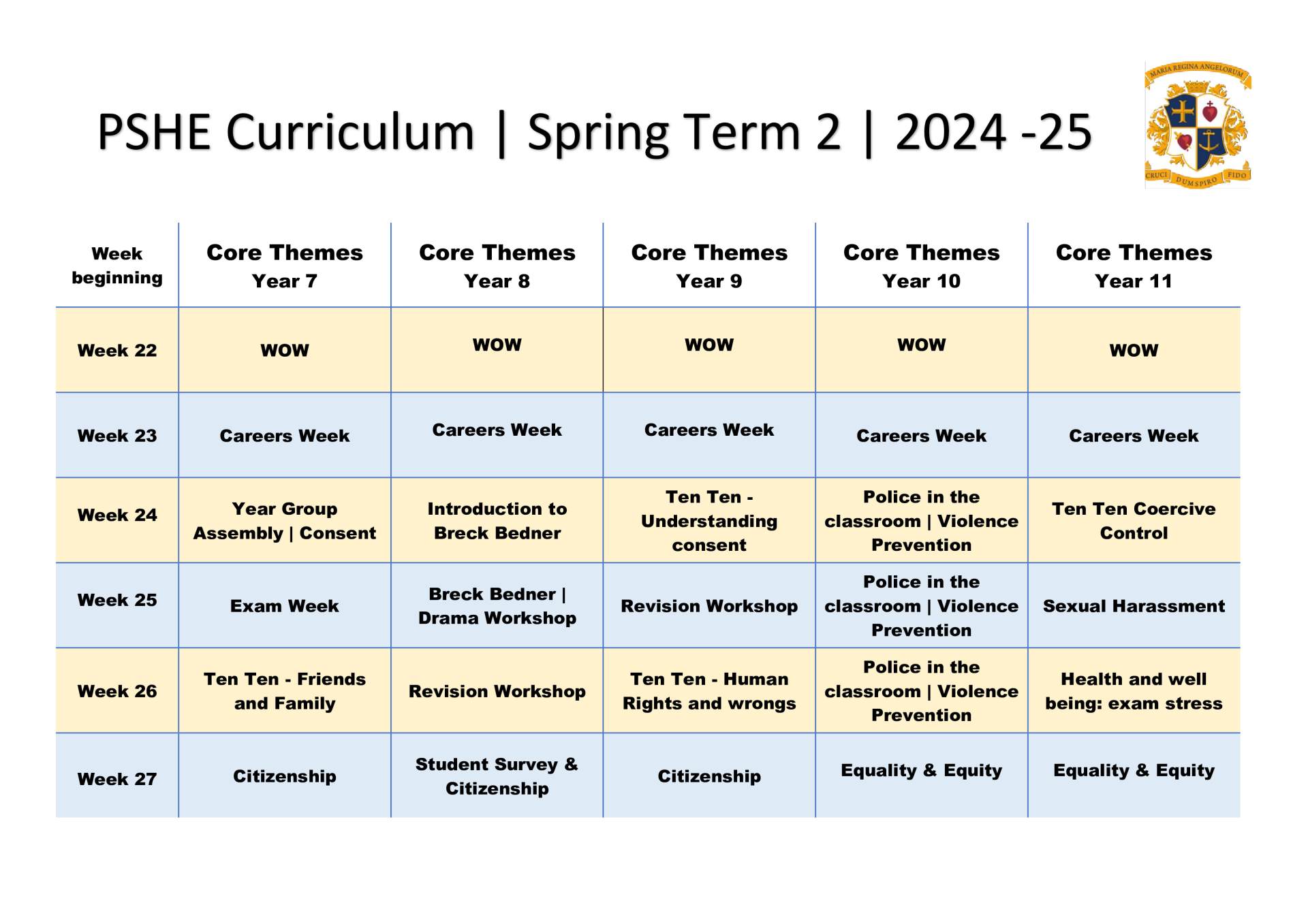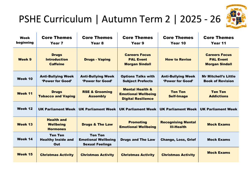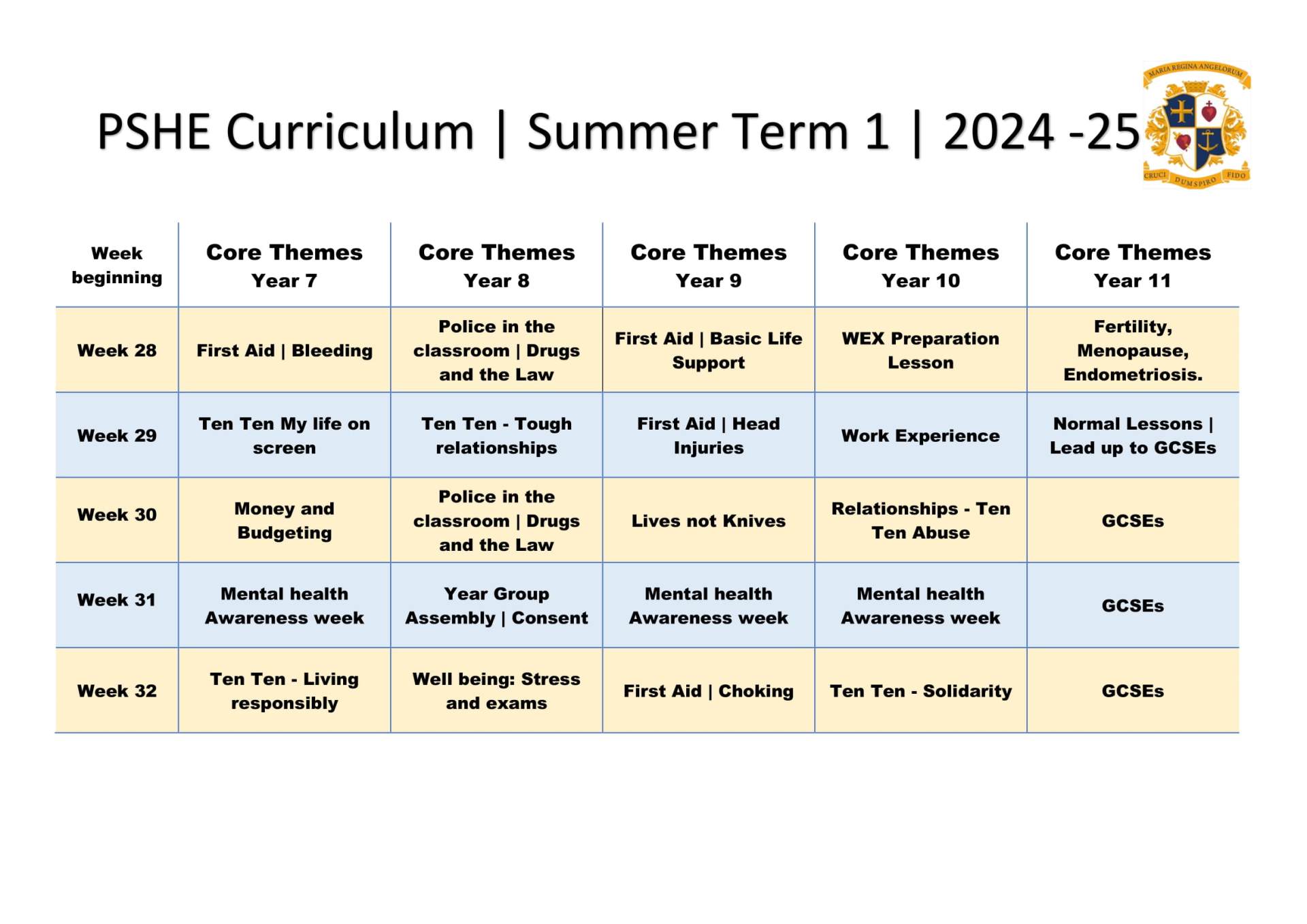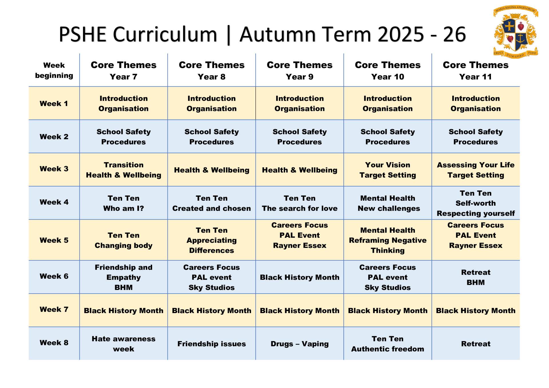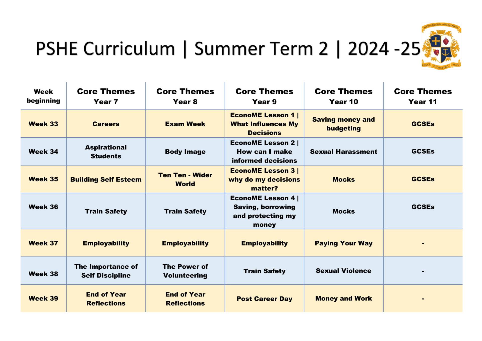 At Key Stage 4 and 5, the themes of health and well-being and healthy relationships are developed further and opportunities for discussion are encouraged within forms. We look at the role of marriage and family relationships, as well as female health issues. Sensitive topics such as sexual harassment, (including child on child,) the dangers of pornography, coercive control, and stalking, are all raised. Students are directed to areas of support. There is also a greater emphasis on careers and the world of work, as students move towards adulthood. We invite in representatives from the workplace to share their experiences and offer work placement opportunities. Post 16 and post 18 educational opportunities are highlighted and more “life skills,” such as managing money and how to run a budget are shared.