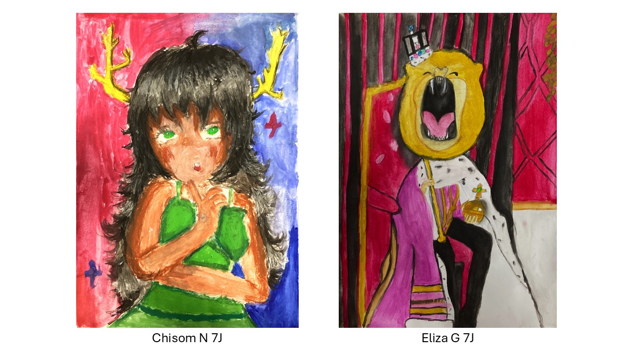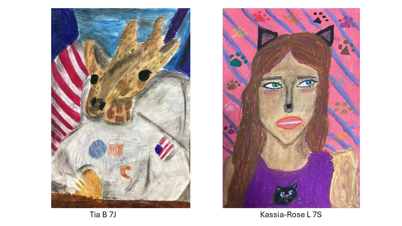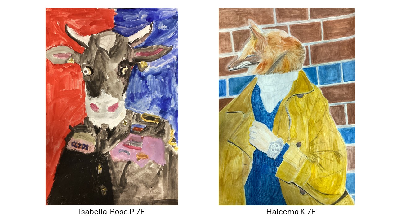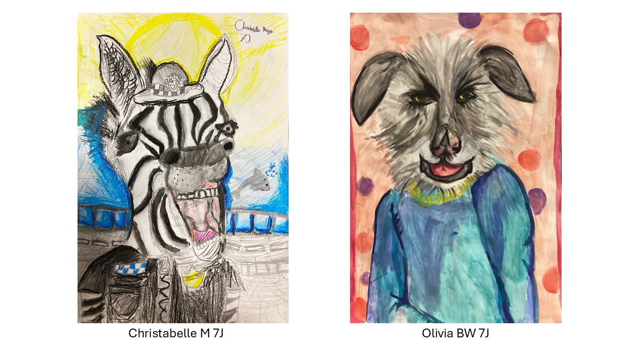 Year 7 recently completed Humanimal portraits based on their own collages which combined human and animal features in a variety of ways, some of which display a fantastic sense of humour and are wildly imaginative.