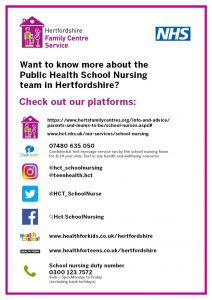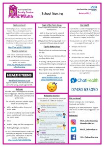 The school nursing service runs a confidential text messaging service for all secondary school pupils. They can use this to get advice on issues such as sexual health, emotional health, bullying, healthy eating and any general health concerns. The nurses can be texted Monday–Friday, 9am to 5pm, on 07480 635050.
